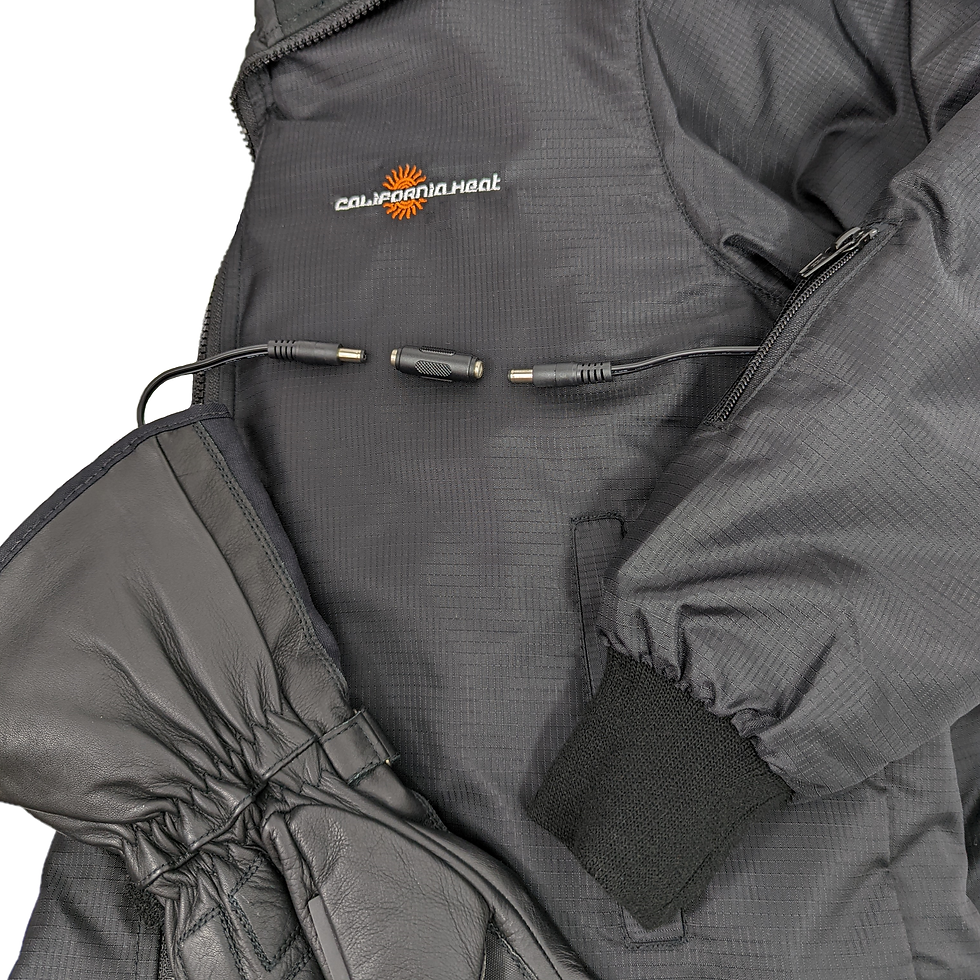 12V clothing heats up by plugging directly into your motorcycle or any vehicle's 12V power source. No separate battery needed - as long as the vehicle is on, you are warm. Clothing requires a controller for operation and can be worn independently or connect a full outfit together. These garments are perfect for motorcycles, snowmobiles, buses, or anyone with a 12V plug-in. For more info on how 12V Heated Clothing works, check out the FAQs Page.